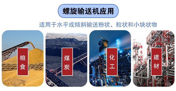 螺旋輸送機廣泛應用于各行業(yè),如建材、化工、工業(yè)、煤礦炭、糧食等行業(yè),適用于水平或傾斜輸送粉狀、粒狀和小塊狀物料,如粉煤灰、石灰、水泥、飼料、肥料、砂漿、糧食、面粉等,物料溫小于200℃。