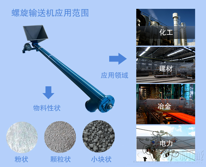 螺旋機廣泛應用于建材,化工,電力,冶金,木炭,糧食等行業。 它適合水平或傾斜地輸送粉狀,顆粒狀和小塊狀物料,例如煤,灰,渣,水泥和谷物等,輸送物料溫度低于200°C。 螺旋輸送機不適用于輸送容易變質,黏稠和結塊的物料。