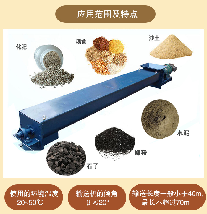 (1)螺旋輸送機是在化工、建材、糧食等部門中廣泛應用的一種輸送設備,主要用于輸送粉狀、顆粒狀和小塊狀物料。它不適宜輸送易變質的、粘性的和易結塊的物料。