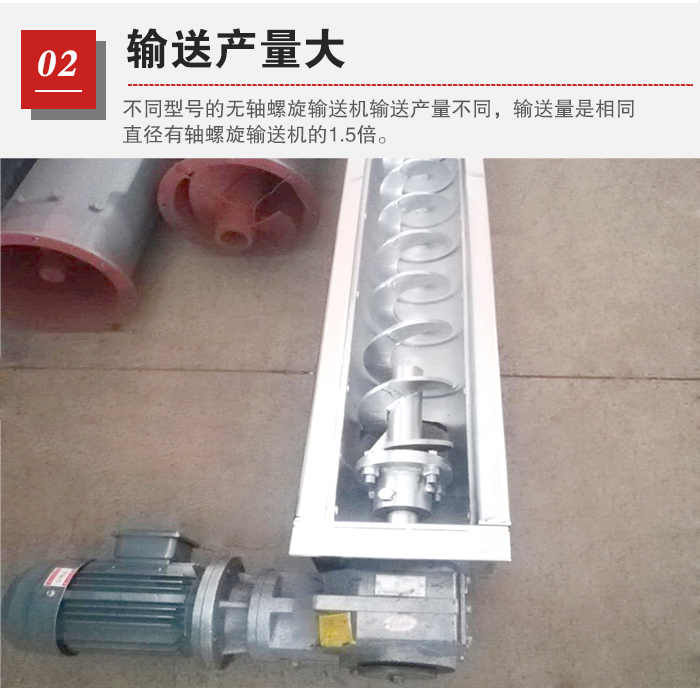 污泥含水量高,輸送產量一般要求比較大,大漢污泥無軸螺旋輸送機型號有WLS200、WLS250、WLS300、WLS350、WLS400、WLS500等規格,不同型號的無軸螺旋輸送機輸送產量不同,根據大漢公司多次測試,一臺無軸螺旋輸送機在1.4-458m³/h,其輸送量是相同直徑有軸螺旋輸送機的1.5倍。