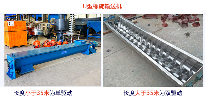 U型螺旋輸送機(jī)為單驅(qū)動(dòng)時(shí),長(zhǎng)度小于35m;雙驅(qū)動(dòng)時(shí),長(zhǎng)度大于35m時(shí);該輸送機(jī)只適合小范圍,小傾角輸送。