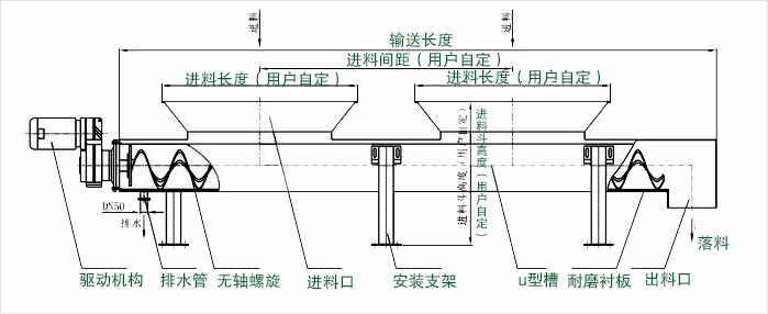 以上是對水平螺旋輸送機結構及工作原理的介紹,水平螺旋輸送機有:200、250、300、400、500、600等型號,用于粉狀/顆粒狀/小塊狀物料的小型、短距離輸送,可根據要求選擇單點加料、單點卸料、多點加料、多點卸料。