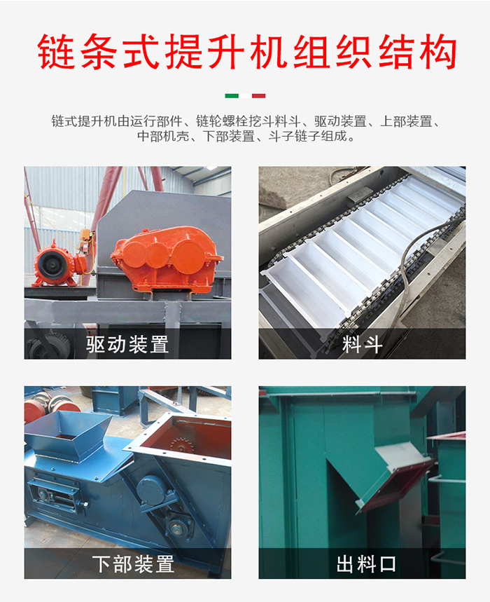 簡介:鏈條式提升機鏈條用于輸送散裝水泥時大多采用深型料斗