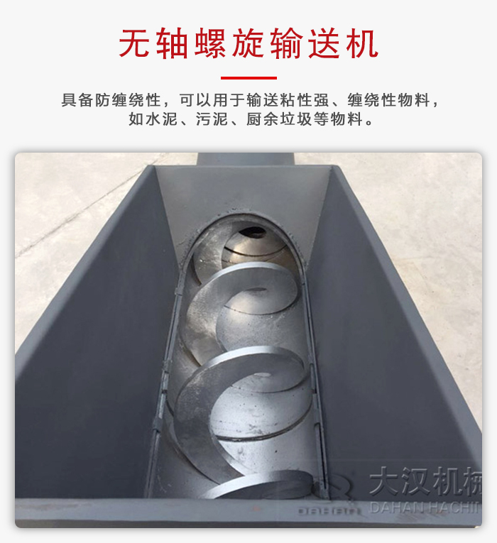 無軸螺旋輸送機(jī)采用了無中心軸設(shè)計(jì),具備防纏繞性,可以用于輸送粘性強(qiáng)、纏繞性物料,如水泥、污泥、廚余垃圾等物料,可水平、傾斜輸送(傾斜角度不超過20°),大漢無軸螺旋輸送機(jī)可分為單無軸和雙無軸螺旋輸送機(jī),還可根據(jù)輸送物料及應(yīng)用場(chǎng)合分為碳鋼、不銹鋼材質(zhì)。