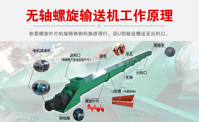 無軸螺旋輸送機(jī)由驅(qū)動(dòng)機(jī)構(gòu)(電機(jī)減速機(jī)、傳動(dòng)軸)、U型槽與支架、無軸螺旋、襯條、蓋板、進(jìn)料口、出料口、緊固件等部件組成。當(dāng)物料從輸送機(jī)的進(jìn)料口進(jìn)入,依靠螺旋葉片的旋轉(zhuǎn)將物料推移滑行,沿U型輸送槽送至出料口,并與壓榨機(jī)或垃圾小車配套,將物料進(jìn)行下一步處理。